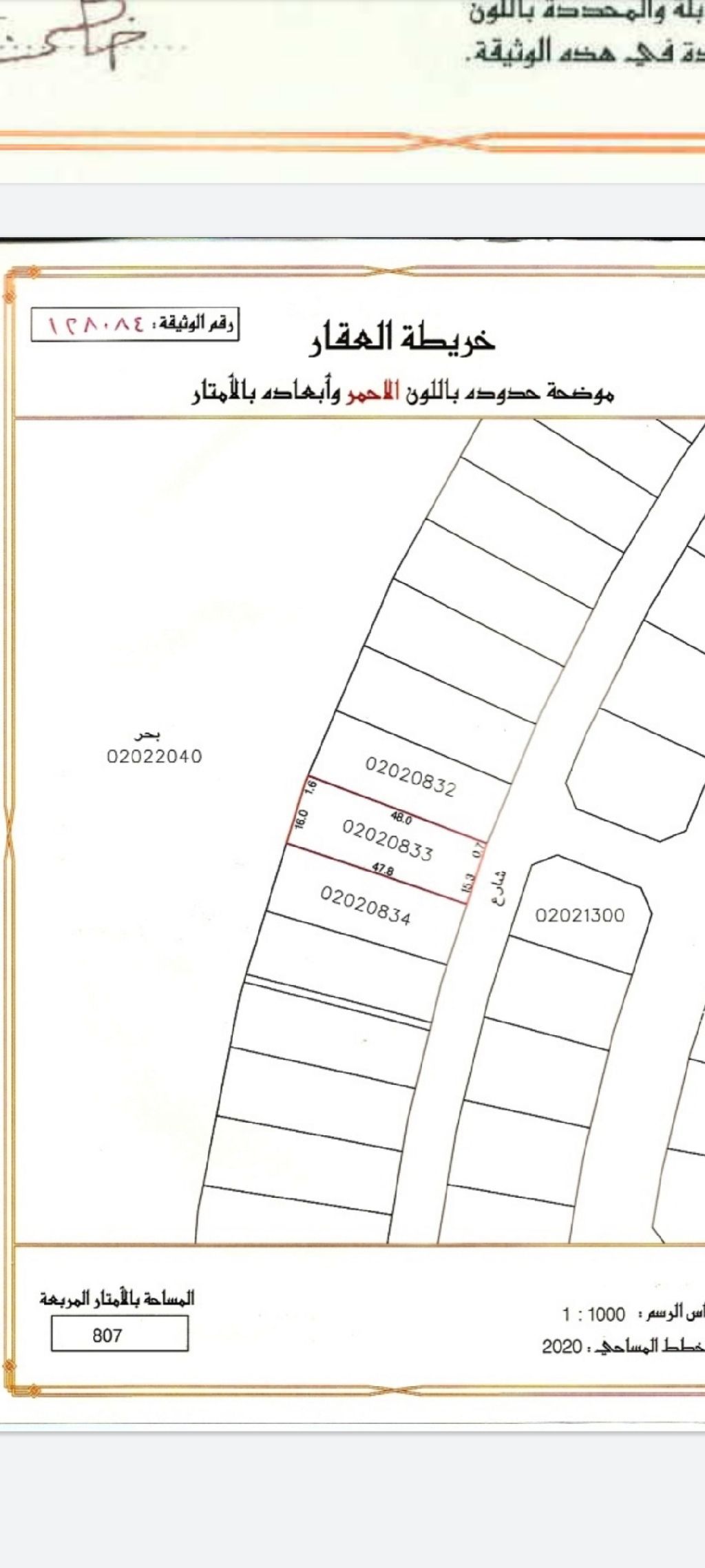 Land for sale on the seafront in Al Mawaj, area 807 SQM, price 45 dinars negotiable, code 9944