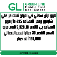 For sale a residential land in Amwaj with freehold ownership on two streets and a passage. The area is 495 SQM, which is 5328.18 square feet. The price per square foot is 30 dinars, and the total price is 160000 dinars