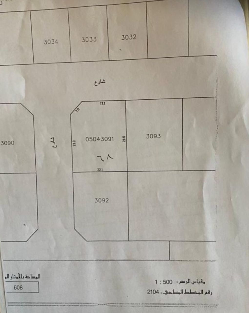 For sale, a land in Al Janabiyah (Sheikh Khalid Plan) with an area of 608 square meters - two streets and a corner - classified as BD buildings - price per foot 33 dinars - total price 215,967 dinars.