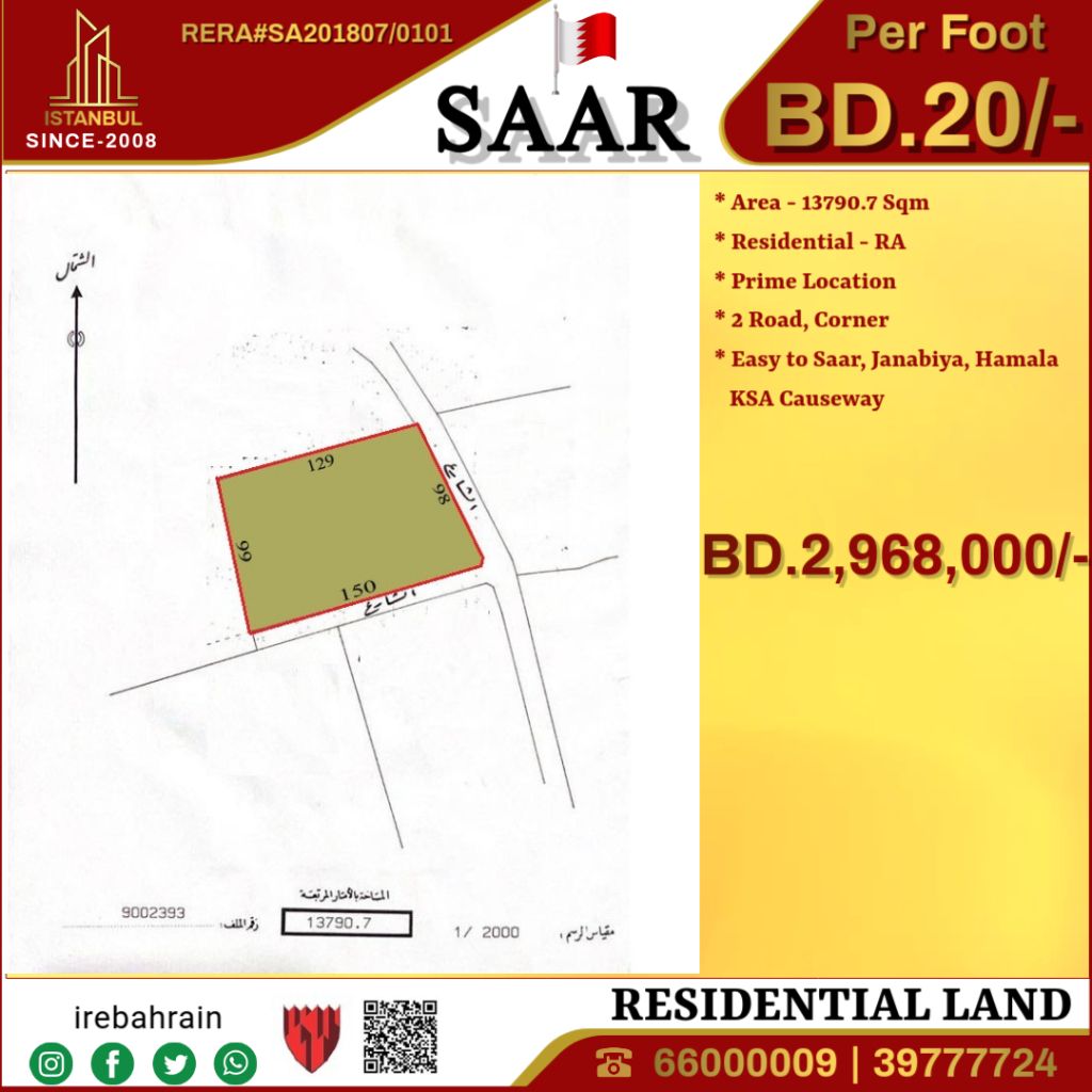 Residential land RA for sale in SAR, Janabiyah - 20 Bahraini dinars per foot. A prime location, this exceptional property is situated in the highly desirable area of SAR and Janabiyah, offering a prestigious site for residential development. Land details Land area 13790 SQM, classification RA (residential) corner plot with access to two roads, subdividable for small projects. Key features