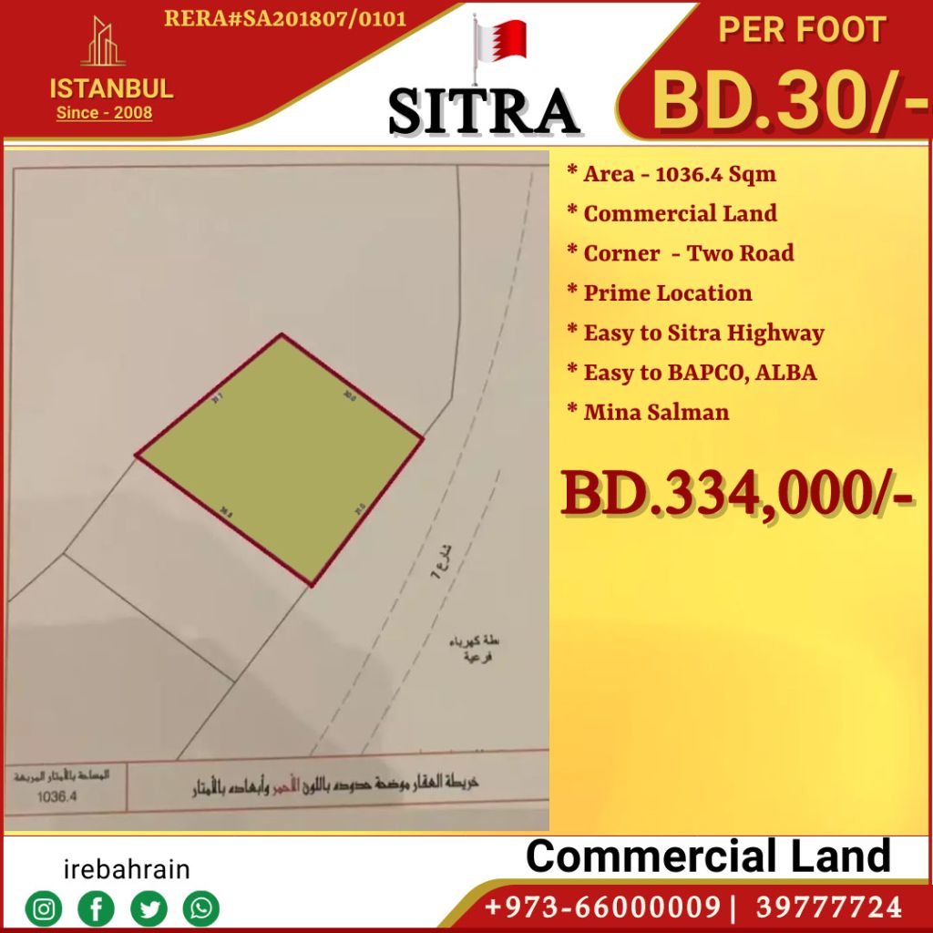 A distinctive commercial corner land for sale in Sitra - 30 Bahraini Dinars per square foot. High - value investment, prime location, ideal for commercial projects. Are you looking for a strategic investment in commercial lands in Bahrain This corner plot, with an area of 1036.4 SQM in Mahazah, Sitra, offers access to a dual carriageway, high visibility, and excellent connectivity - making