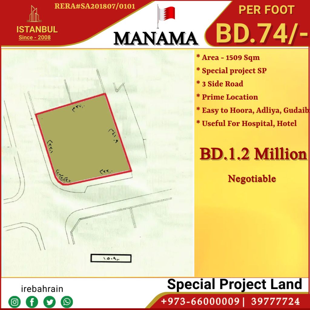 A corner land for a distinguished project (SP) for sale in Manama Center - 74 Bahraini Dinars per foot. Exclusive investment opportunity. A multi - purpose commercial land in a prime city center location. Seize this high - value investment opportunity in the heart of Manama. The corner land, classified under category SP with an area of 1509 SQM, offers access to three roads, making it an ideal