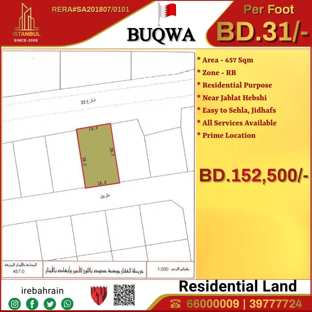 A luxurious residential land for sale in Bqa'ou - 31 Bahraini dinars per square foot, ideal for a villa or residential building. High investment value, prime location. Discover an excellent investment opportunity in Bqa'ou, near Jeblat Hebshi. This residential land, with an area of 457 SQM and designated for RB zones, offers great potential for a luxurious villa or a multi - unit residential