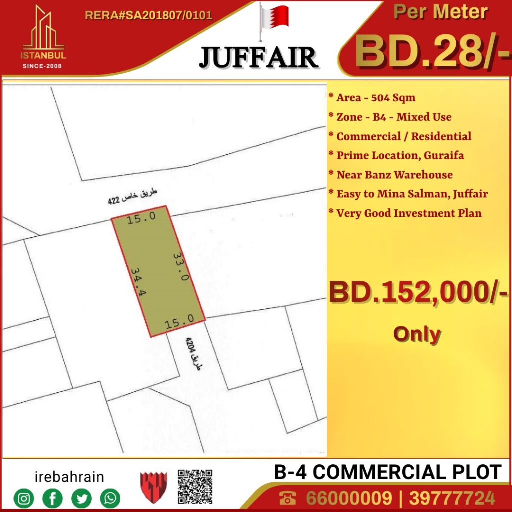 A distinguished land plot for sale in Al Ghurayfiyah, Old Juffair - 28 Bahraini dinars per square foot. Exceptional location, great investment opportunity for residential or commercial use. Discover an excellent opportunity to own a land plot with an area of 504 SQM in the highly desirable Al Ghurayfiyah area, located in the heart of Old Juffair. This land, classified as B4, offers huge potential