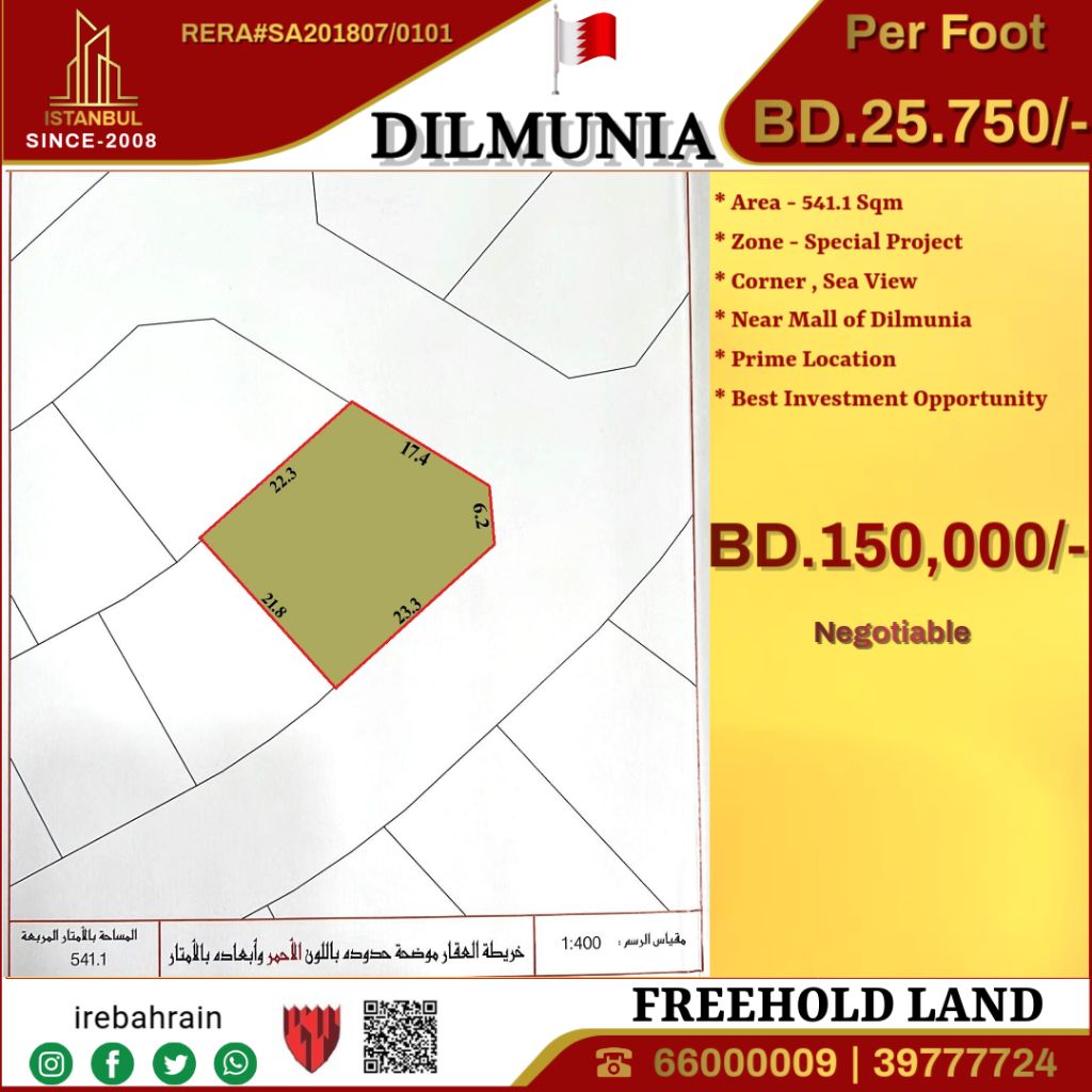 A freehold land for sale in Dilmunia Island - 150000 Bahraini Dinar. Prime location, corner plot. This exclusive freehold land is located in the prestigious Dilmunia Island, featuring stunning proximity to the sea, making it an ideal investment opportunity. Location Dilmunia Island, main waterfront area. Land area 541.1 SQM. Price 25750 Bahraini Dinar per foot (total 150000 Bahraini
