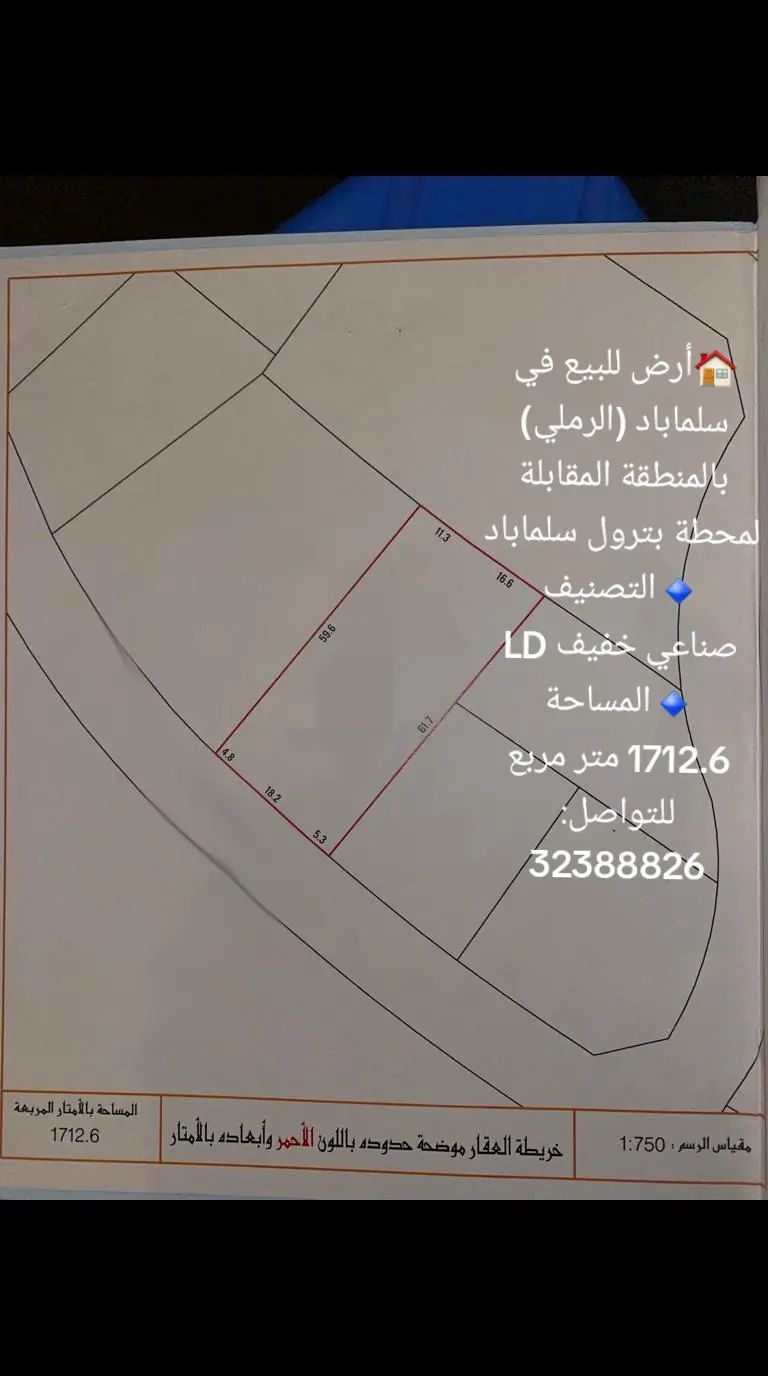Land for sale in Salmabad (Al - Ramli) opposite Salmabad petrol station, classified as LD light Industrial Area 1712.6 SQM, for contact