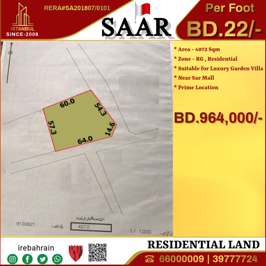 A distinctive residential land for sale in Saar - 22 Bahraini dinars per square foot, ideal for developing a luxury villa. Corner plot with a prime location in Saar, behind Saar Mall. Land area is 4072 SQM. Classification residential (suitable for building a villa with an elegant garden) Total price is 964000 Bahraini dinars (negotiable) Strategic location with easy access to St. Christopher