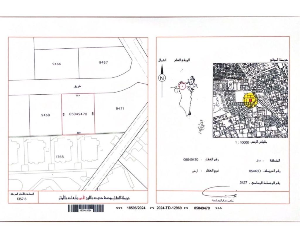Lands for sale in SAR, a prime location near SAR Mall, area 1357 meters, land area 1367 meters, price per foot 24 dinars