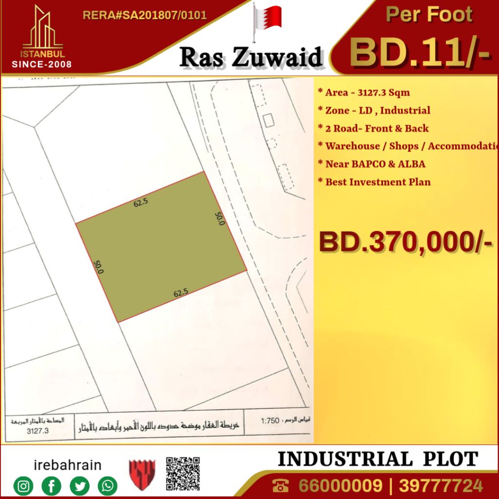 A light Industrial land for sale in Ras Zuwayd at a price of 11 dinars per foot. Prime location with streets on both sides, an excellent investment opportunity. The location is Ras Zuwayd with front and rear streets. The land area is 3127.3 SQM. Classification is light Industrial (LD) The price is only 370000 dinars (at 11 dinars per foot) A rare opportunity suitable for a factory, warehouse