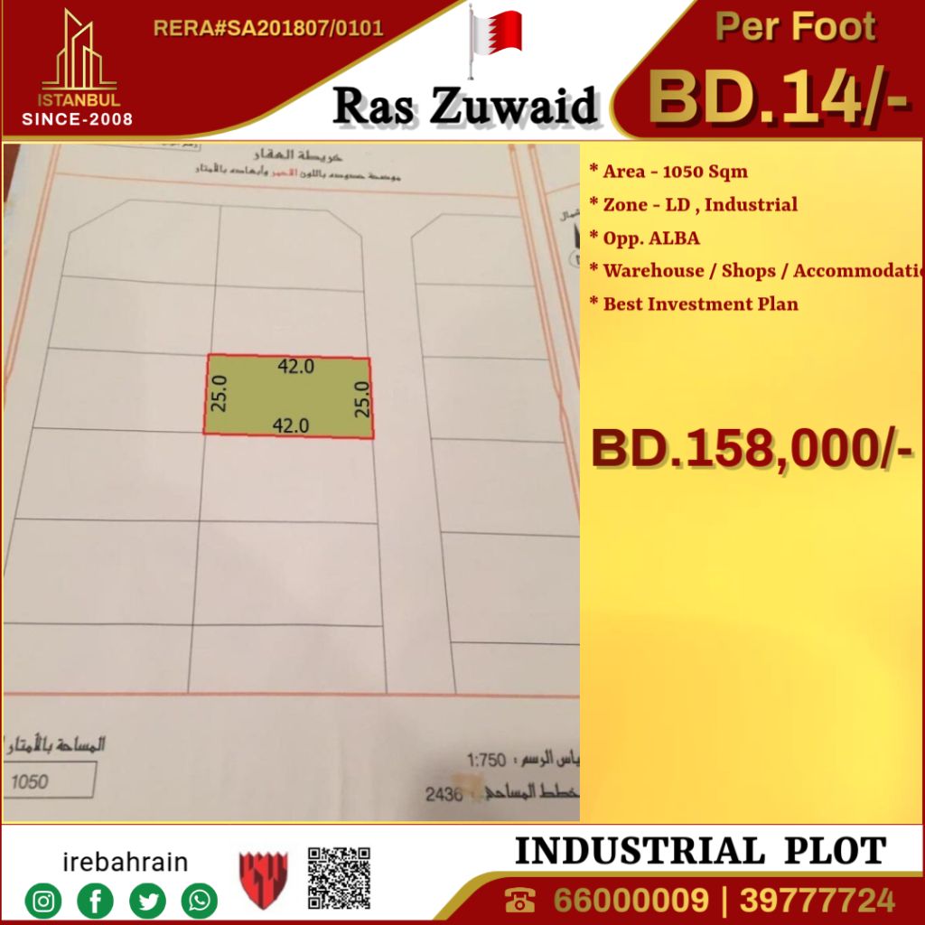 An Industrial investment opportunity in Ras Zuwayd - 14 Bahraini dinars per square foot. Prime location opposite ALBA. Negotiable price. Are you looking to invest in the thriving Industrial sector in Bahrain Do not miss the chance to buy a light Industrial land in Ras Zuwayd - ideal for building a workshop, warehouse, or factory. Property features Land area of 1050 SQM opposite ALBA, light