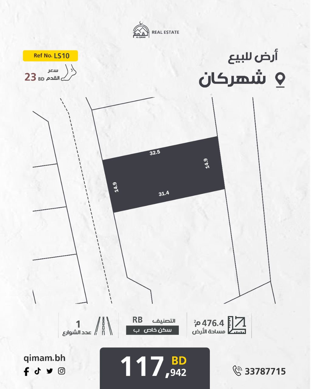 For sale a residential land in Shahrakkan, area 476.3 SQM, dimensions 33.7*14.4 meters, facing one street, classification RB (residential) price per foot 23 Bahraini dinars, total price 117917 Bahraini dinars, negotiable, located in a quiet area suitable for residential construction. For contact Al - Qimam real estate and Transaction Processing