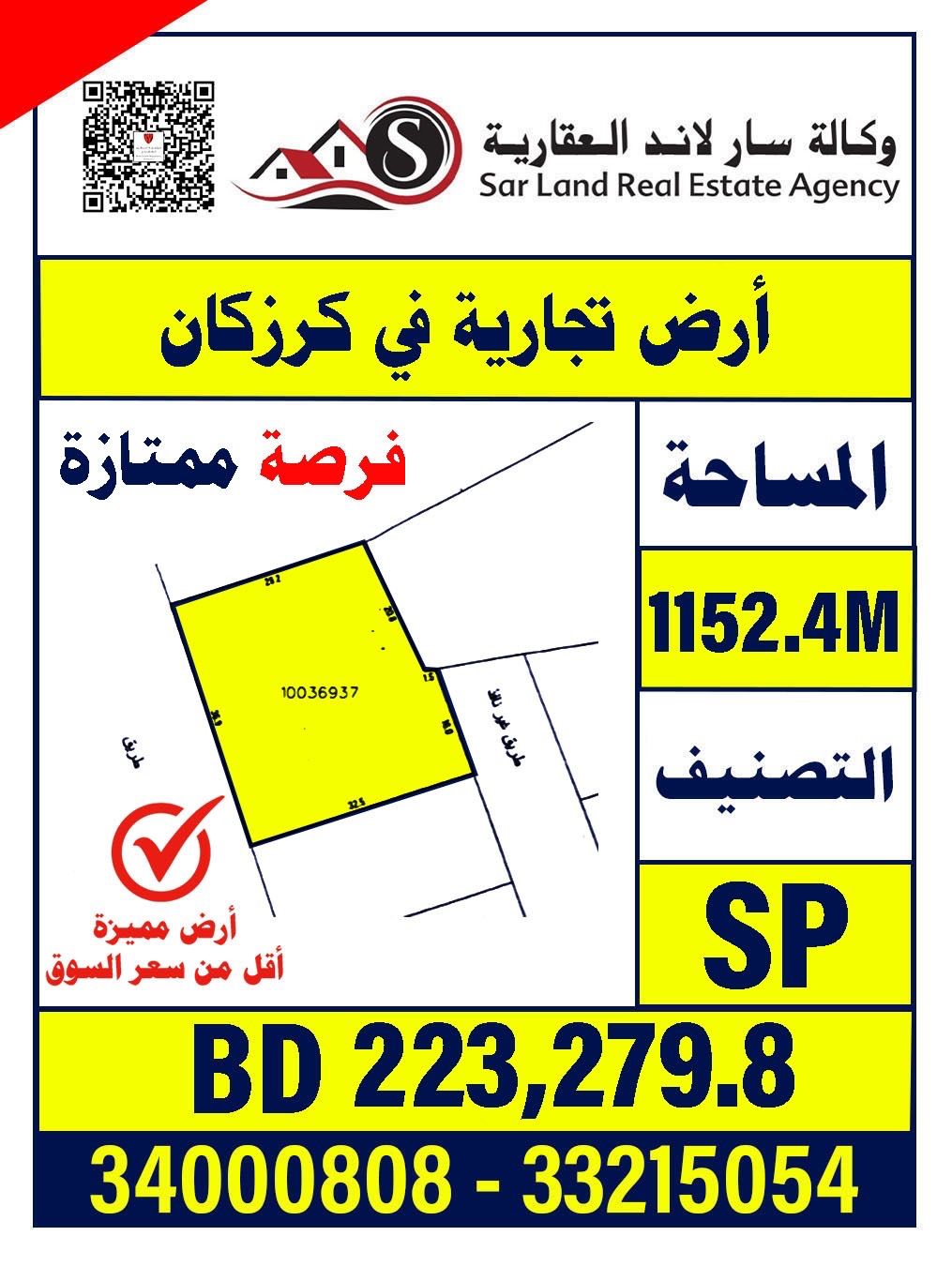 A vacant land in Karzakkan, commercial, area 1152.4 meters, SP classification, price 18 dinars per foot, agency SAR Land real estate