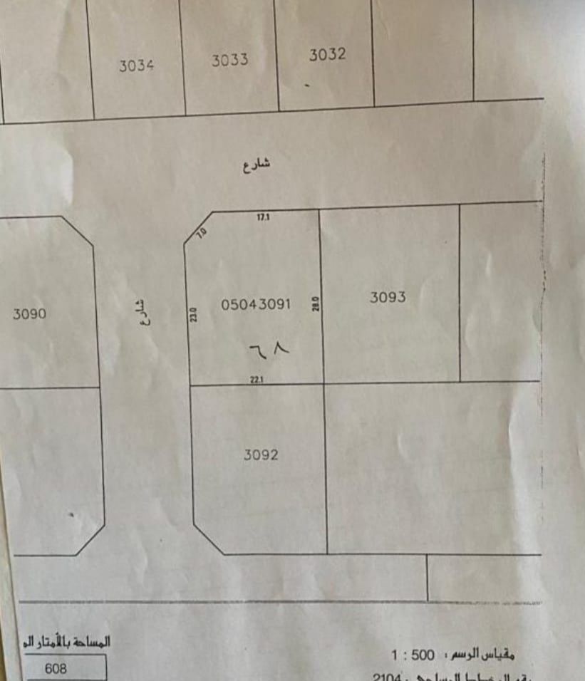 For sale an investment land in Janabiyah, on two streets and a corner, area 608 SQM, classification apartment buildings BD, price per square foot 33 dinars, total price 215967 dinars
