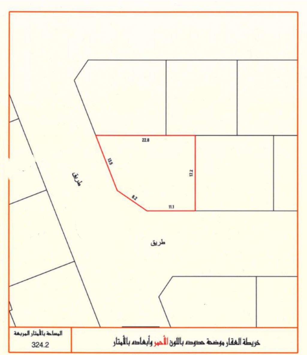 For sale: a residential land plot in Qalali, on two streets and a corner. Land area is 324.2 square meters. Classification is residential RA. Price per square foot is 28.4 dinars. Total price is 99,107 dinars.