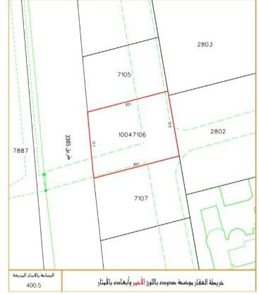 For sale, a land in Al - Malikiyya, area 400.5 SQM, classification residential RB, price per foot 25 dinars, total price 107775 dinars