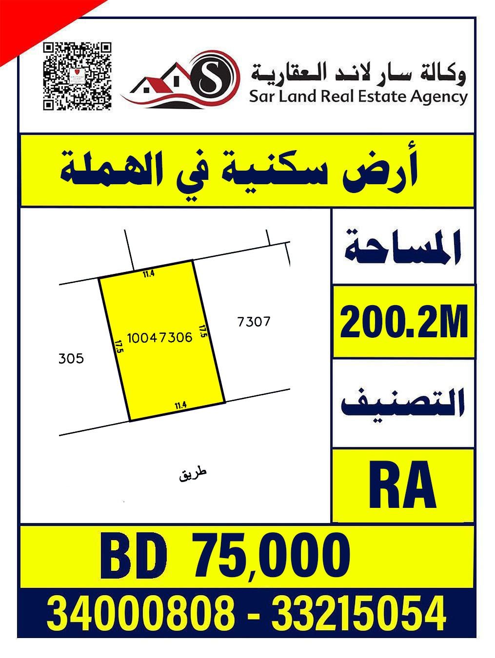 For sale: a residential land in Al Hamalah with an area of 200 square meters for 75,000 BHD.