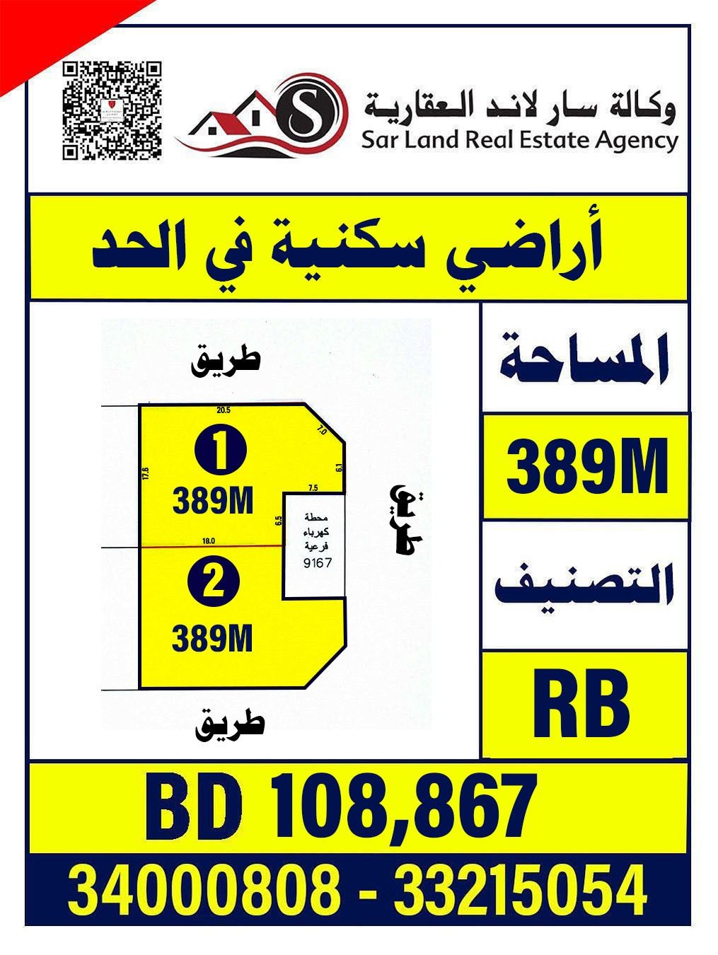 Residential land for sale in Al-Hidd, with a plot area of 389 square meters, at a final price of 108,867 Bahraini dinars.