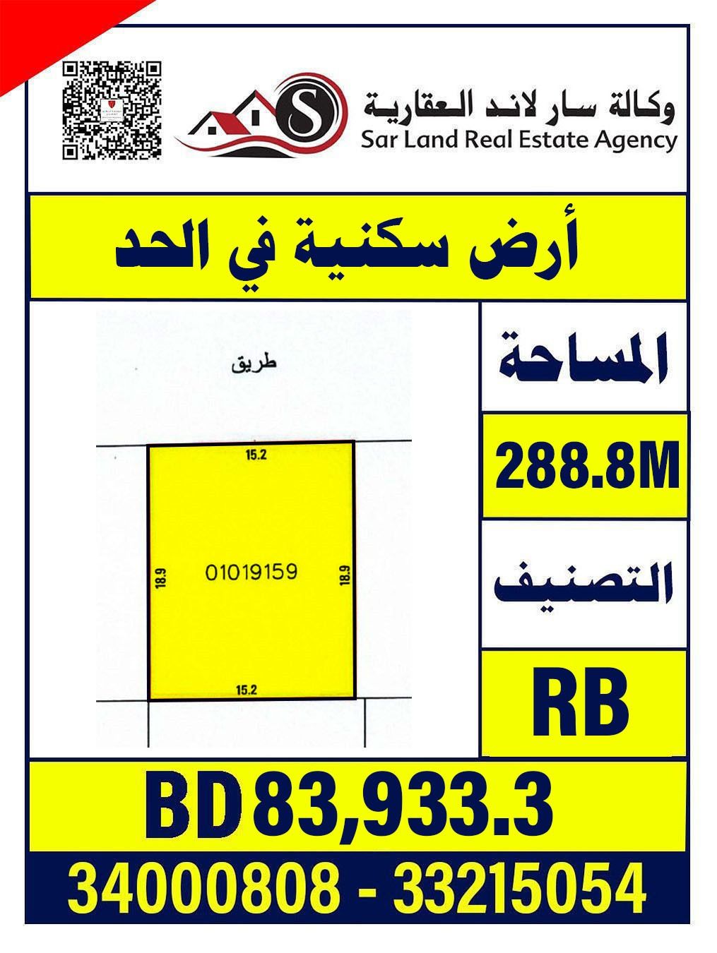For sale: a residential land in Al-Hadd, 288.8 square meters, at a final price of 83,933.3 thousand.
