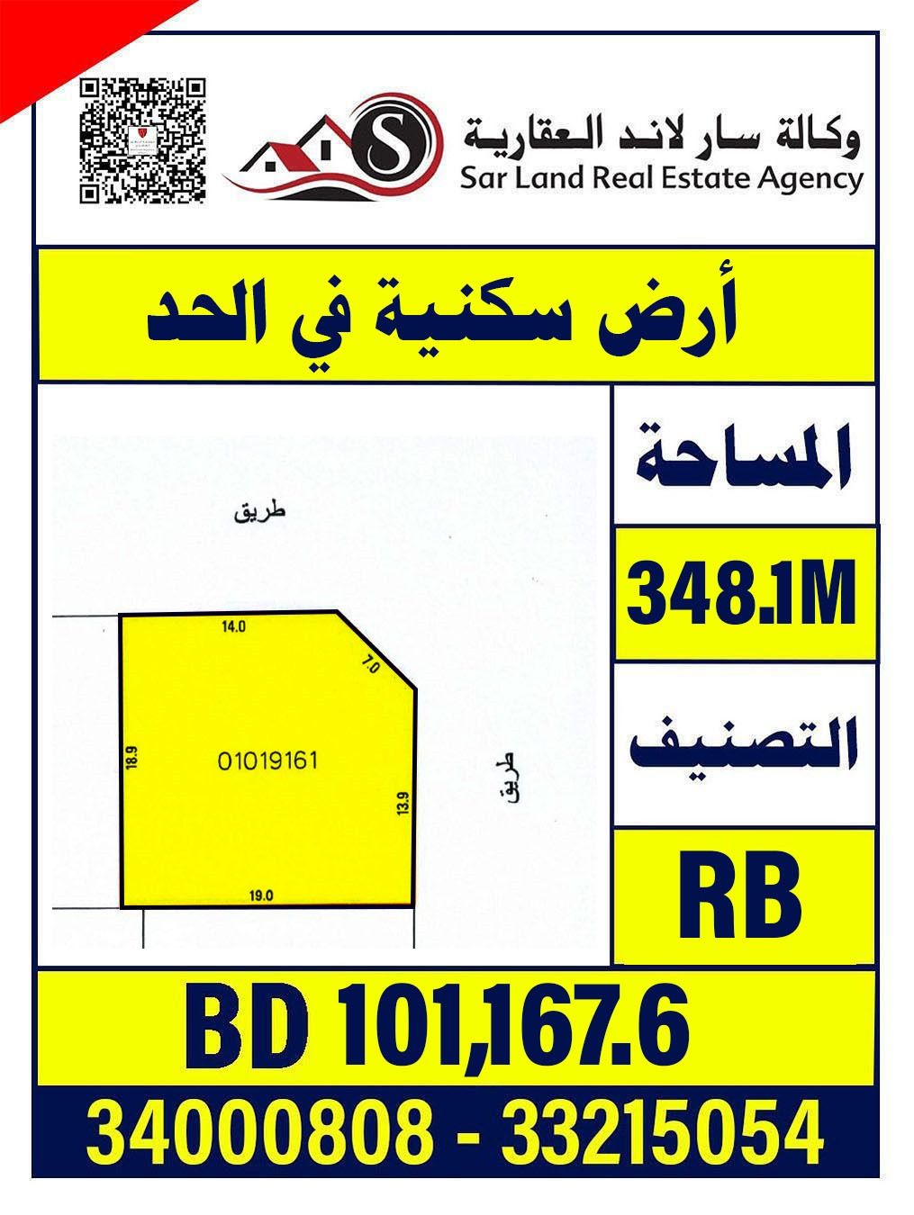 For sale, a residential land in Al-Hadd, 348.1 square meters, at a final price of 101,167.6 thousand.