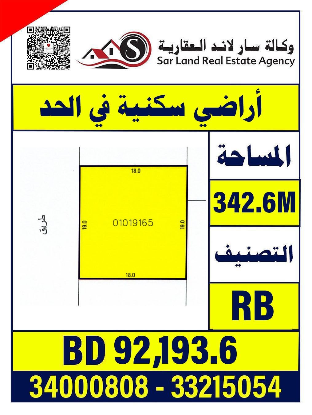 For sale: a residential land in Al-Hadd, 342.6 square meters, at a final price of 92,193.6 thousand.
