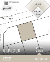 For sale, a land in Askar with an area of 500.5 SQM, classified as WS, price 86190 thousand dinars. For inquiries, contact Abdullah Fadhl at + harbourbh harbourrent AF - LS 11263