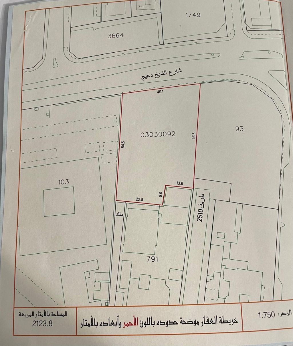 For sale: Land in Qudaibiya, adjacent to the Council of Representatives and the UAE Embassy, located on Shaikh Duaij Street. Land area is 2123.8 square meters. Asking price is BD 40 per square foot.