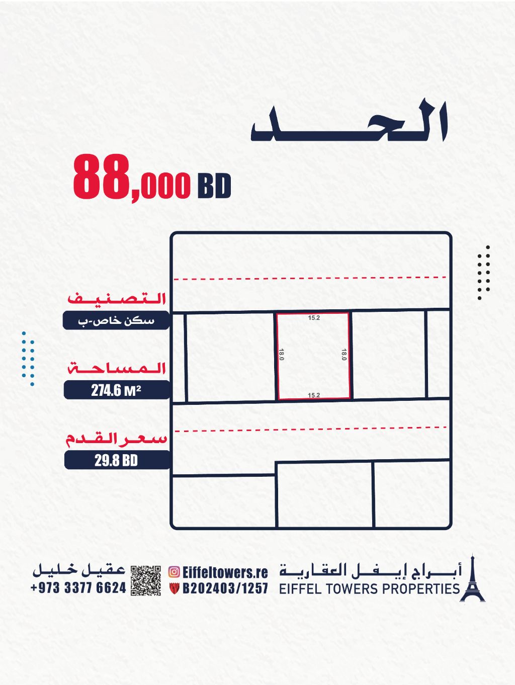 Eiffel Towers Real Estate Company offers a land for sale in Al-Hadd. The area is 274.6 square meters, classified as private residential (RB). The price per square foot is 29.8 BD, and the total price is 88,000 BD. For contact, reach out to Aqeel Khalil.