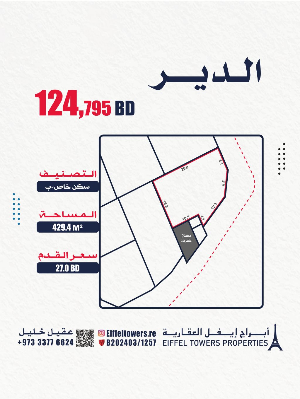 Eiffel Towers Real Estate Company offers a land for sale in Al-Deir. The area is 429.4 square meters, classified as private residential (RB). The price per foot is 27 BD, and the total price is 124,795 BD. For contact, call Aqeel Khalil.