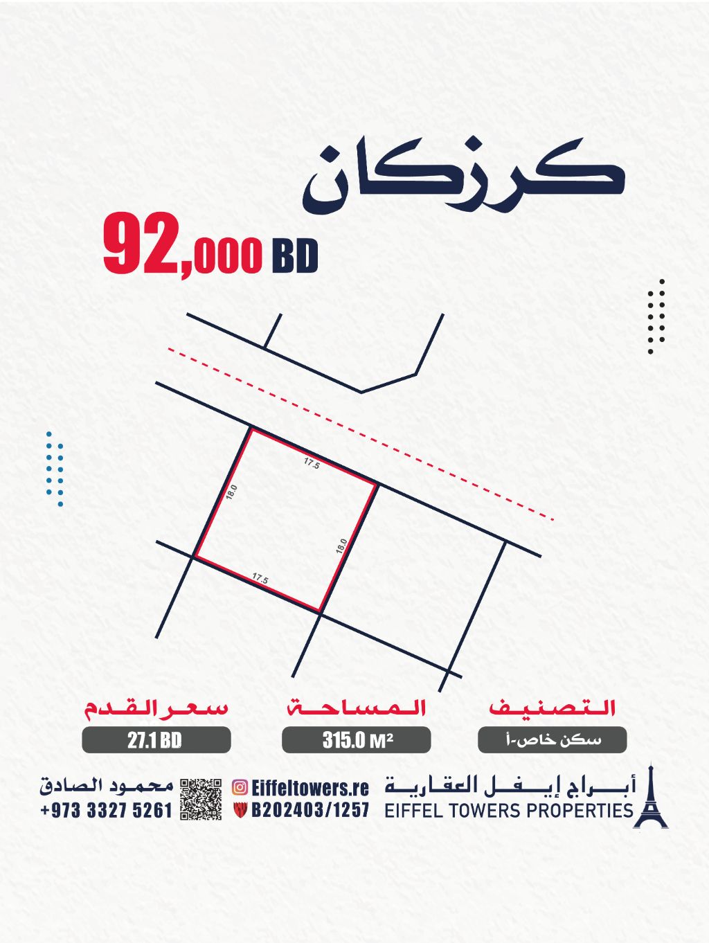 Eiffel Towers Real Estate Company offers a land for sale in Karzakhan. The area is 315 square meters, classified as private residential (A RA). The price per square foot is 27.1 BD, and the total price is 92,000 BD. For contact, reach out to Mahmoud Al-Sadiq.