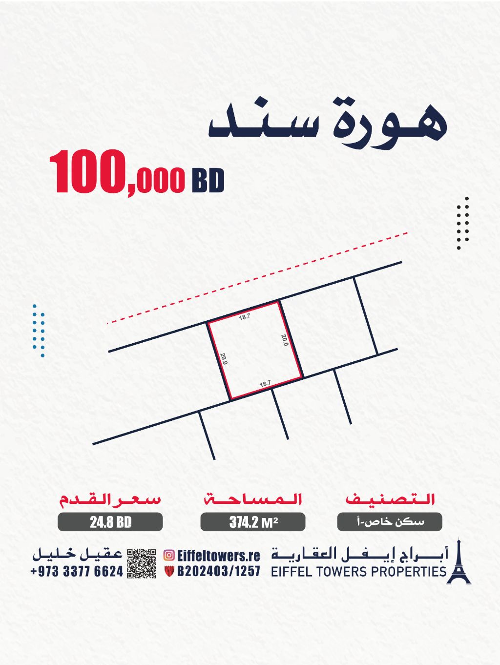 Eiffel Towers Real Estate Company for sale: A land in Hoora with a deed. The area is 374.2 square meters, classified as private residential (A RA). Price per foot is 24.8 BD, total price is 100,000 BD. For contact: Aqeel Khalil.