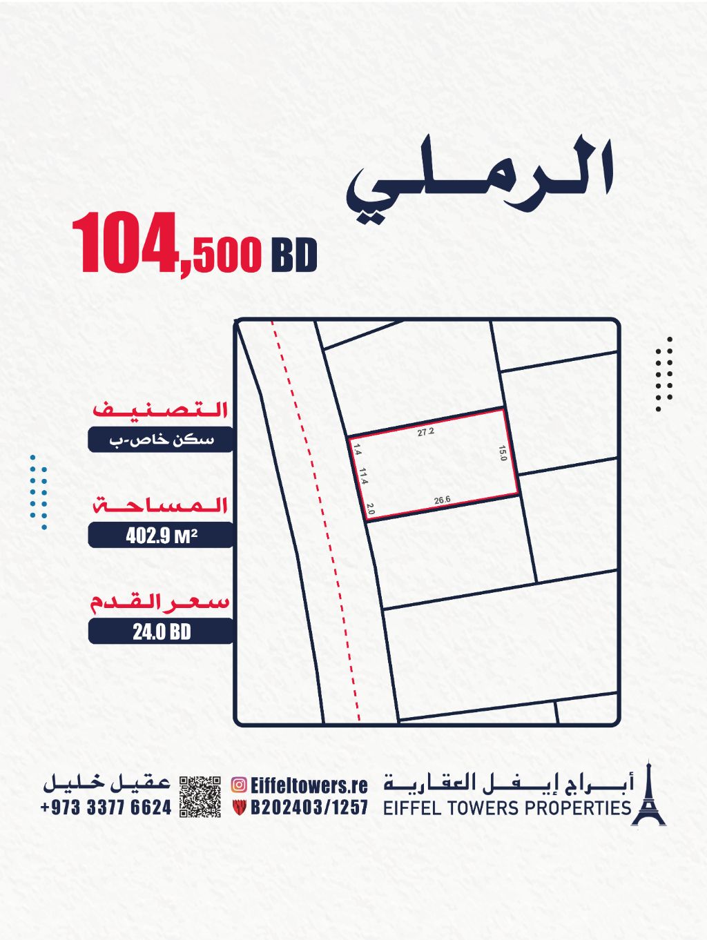 Eiffel Towers Real Estate Company for sale: A land in Al Rumaili with an area of 402.9 square meters, classified as private residential (RB). Price per square foot is 24 Bahraini dinars, total price is 104,500 Bahraini dinars. For contact: Aqeel Khalil.