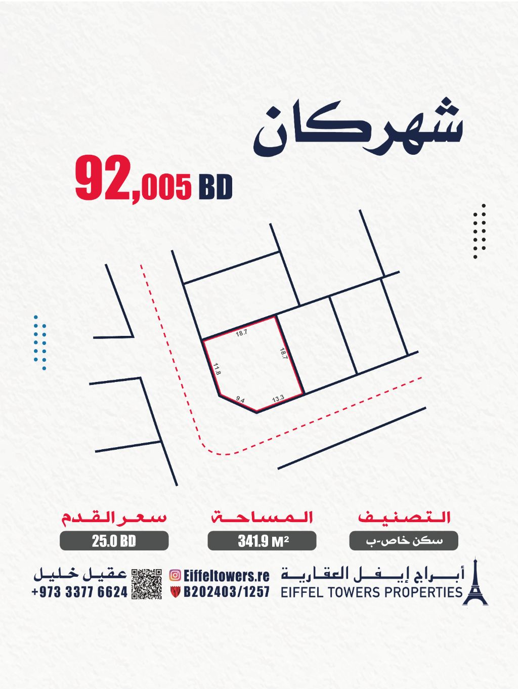 Eiffel Towers Real Estate Company offers for sale a land in Shahrakan with an area of 341.9 square meters, classified as private residential (RB). The price per square foot is 25 BD, and the total price is 92,005 BD. For contact, reach out to Aqeel Khalil.