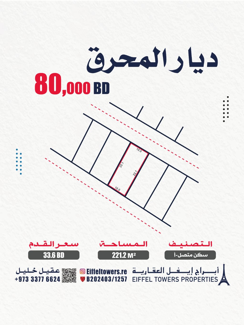 Eiffel Towers Real Estate Company offers for sale a land in Diyar Al Muharraq with an area of 221.2 square meters, classified as attached residential (RHA). The price per square foot is 33.6 BD, and the total price is 80,000 BD. For contact, reach out to Aqeel Khalil.