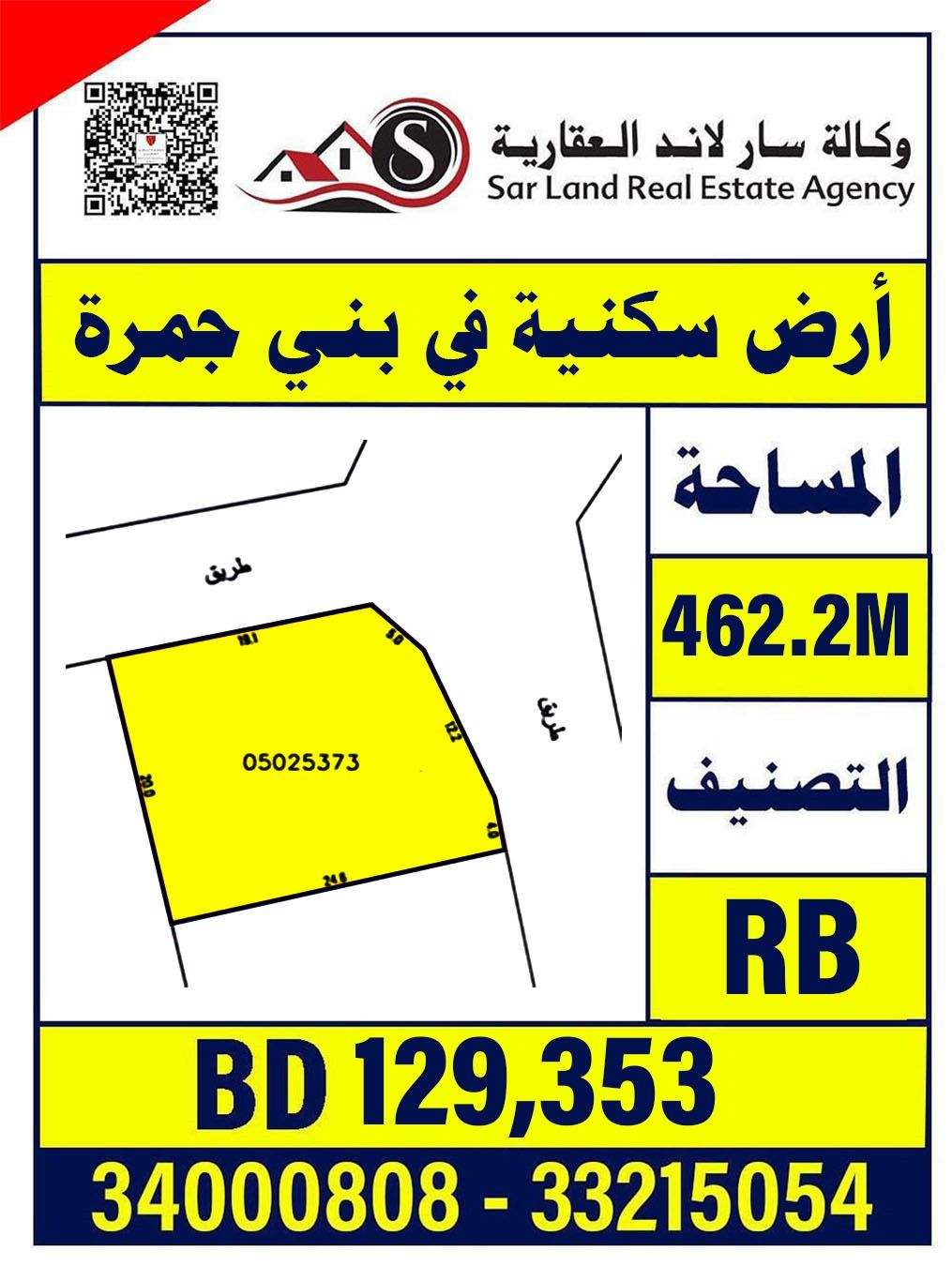 For sale: a residential land plot in Bani Jamra, 462.2 square meters, corner location, priced at 129,353 thousand.