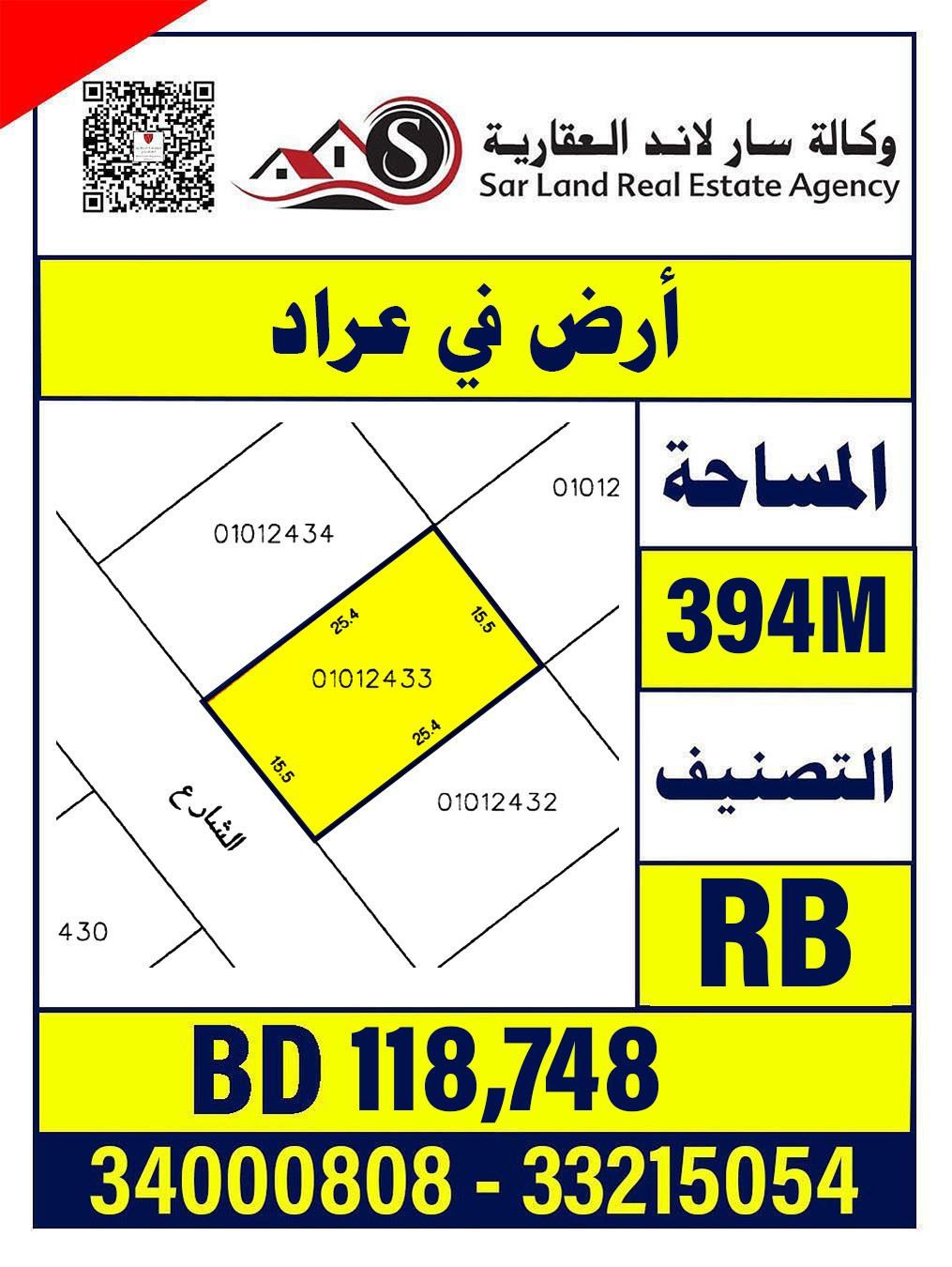 For sale, a residential land in Arad with an area of 394 square meters at a price of 118,748 thousand.