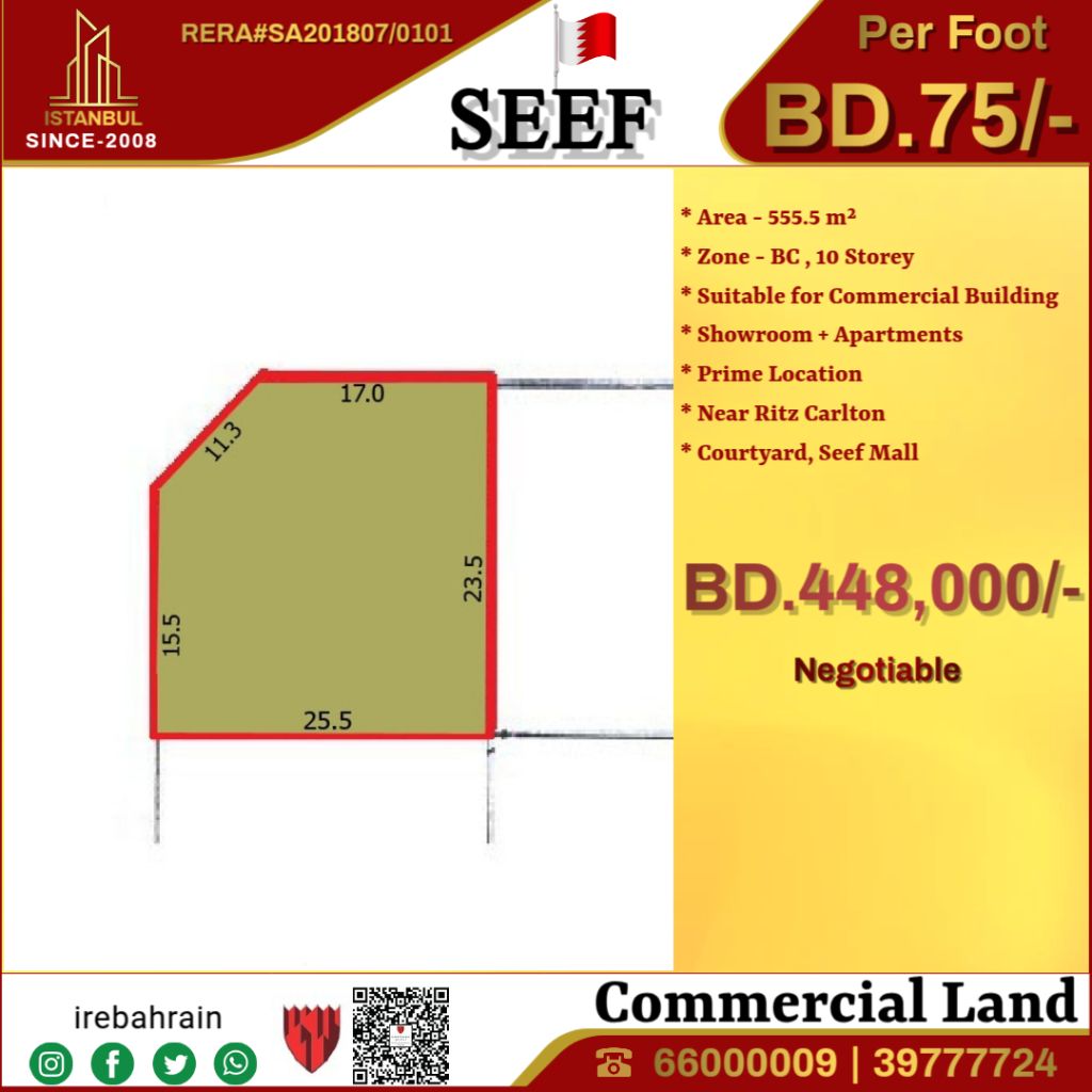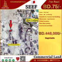A commercial corner land for sale in Seef, priced at 75 Bahraini dinars per square foot. This commercial property is located in the heart of the Seef area, in a prime location, adjacent to the Ritz-Carlton Hotel, the courtyard square, Seef Mall, the Bin Faqeeh building, and others. The land area is 555.5 square meters, classified as a residential property, consisting of 10 floors, with a freehold ownership system. It is suitable for establishing commercial exhibitions with apartments on 10 floors (residential or commercial). We offer a price of 55 Bahraini dinars per square foot. The total price will be calculated.