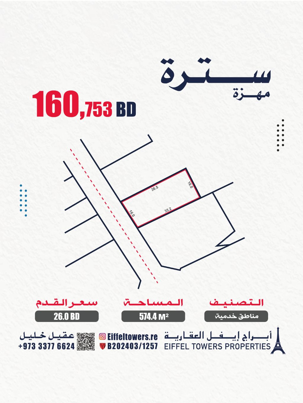 Eiffel Towers Real Estate Company offers for sale a land in Sitra (Mahaza). The area is 574.4 square meters. Classification: Service Areas - S. Price per square foot: 26 BD. Total price: 160,753 BD. For contact: Aqeel Khalil.