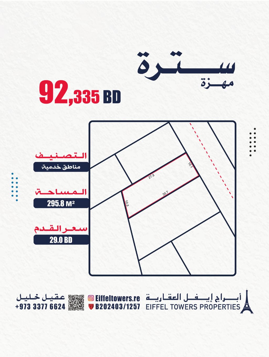 Eiffel Towers Real Estate Company for sale: land in Sitra (Mahaza), area 295.8 sqm, classification service areas - S, price per square foot 29 BD, total price 92335 BD. Contact Aqeel Khalil.