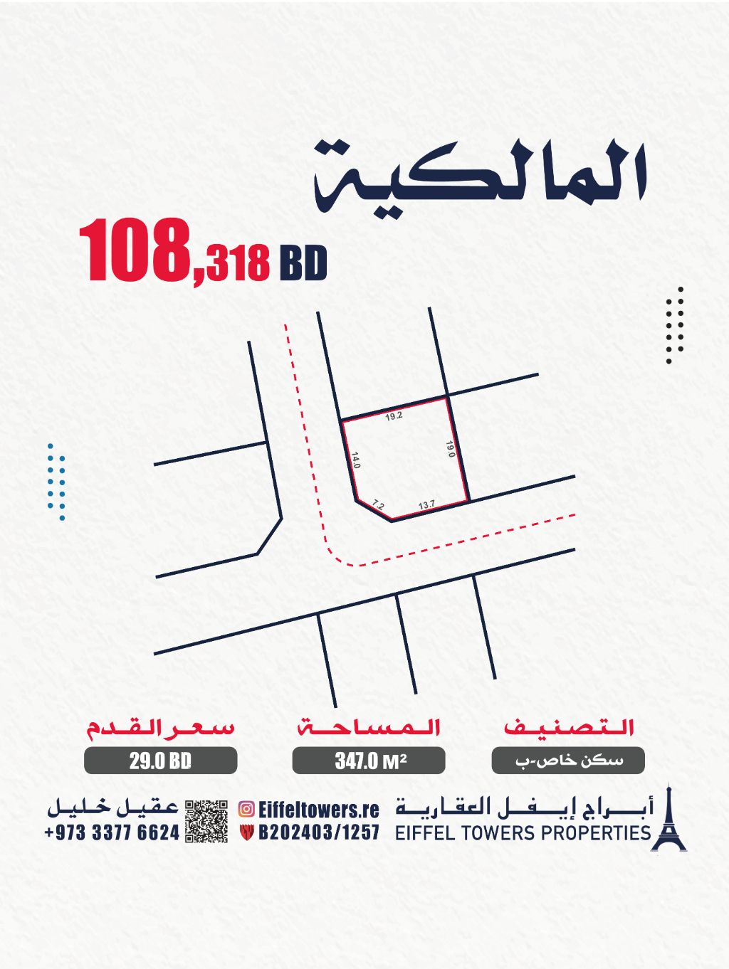 Eiffel Towers Real Estate Company for sale: Al-Malikiyah land, area 347 sqm, classification: private residential (RB), price per square foot: 29 BD, total price: 108,318 BD. Contact: Aqeel Khalil.