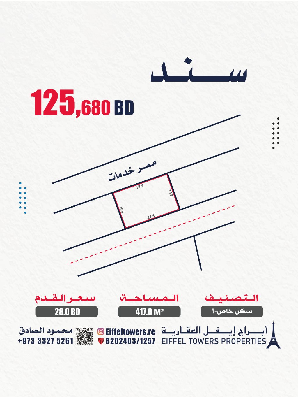 Eiffel Towers Real Estate Company for sale: A land with a deed, area 417m², classified as private residential (A RA), price per foot 28 BD, total price 125,680 BD. For contact: Mahmoud Al-Sadiq.