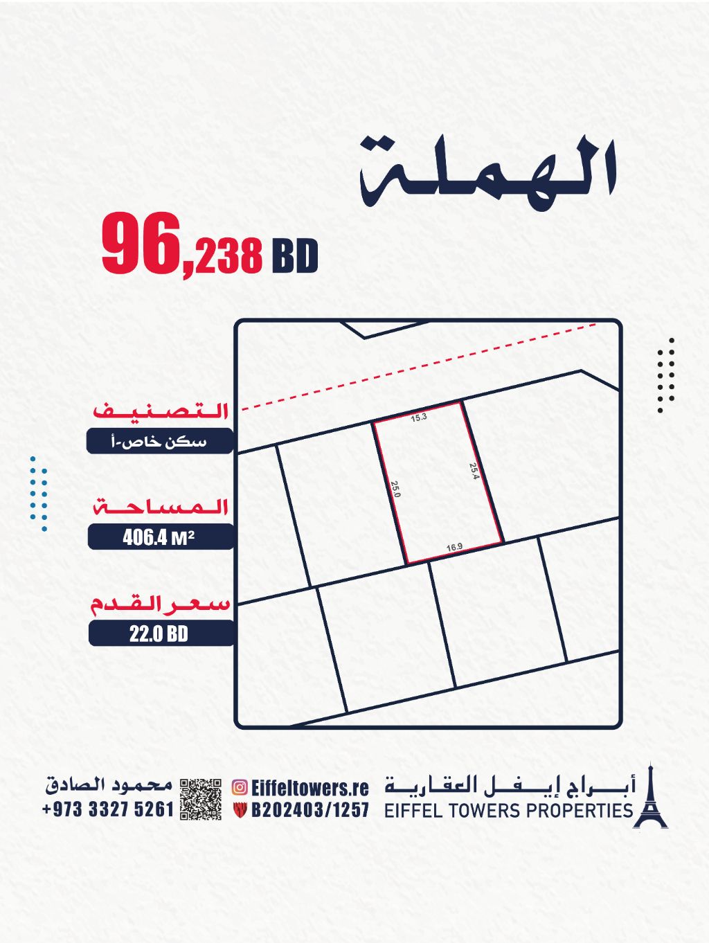 Eiffel Towers Real Estate Company offers for sale a land in Al Hamla with an area of 406.4 square meters, classified as private residential (A RA), price per square foot 22 BD, total price 96238 BD. For contact: Mahmoud Al Sadiq.