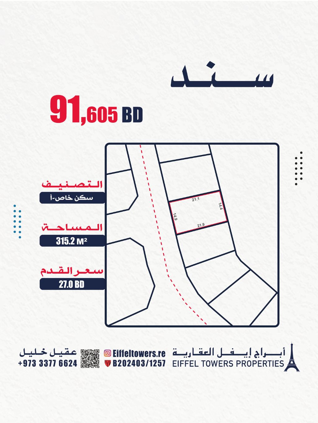 Eiffel Towers Real Estate Company for sale: A land in Sind, area 315.2 m², classification: private residential (A RA), price per foot 27 BD, total price 91605 BD. For contact: Aqeel Khalil.
