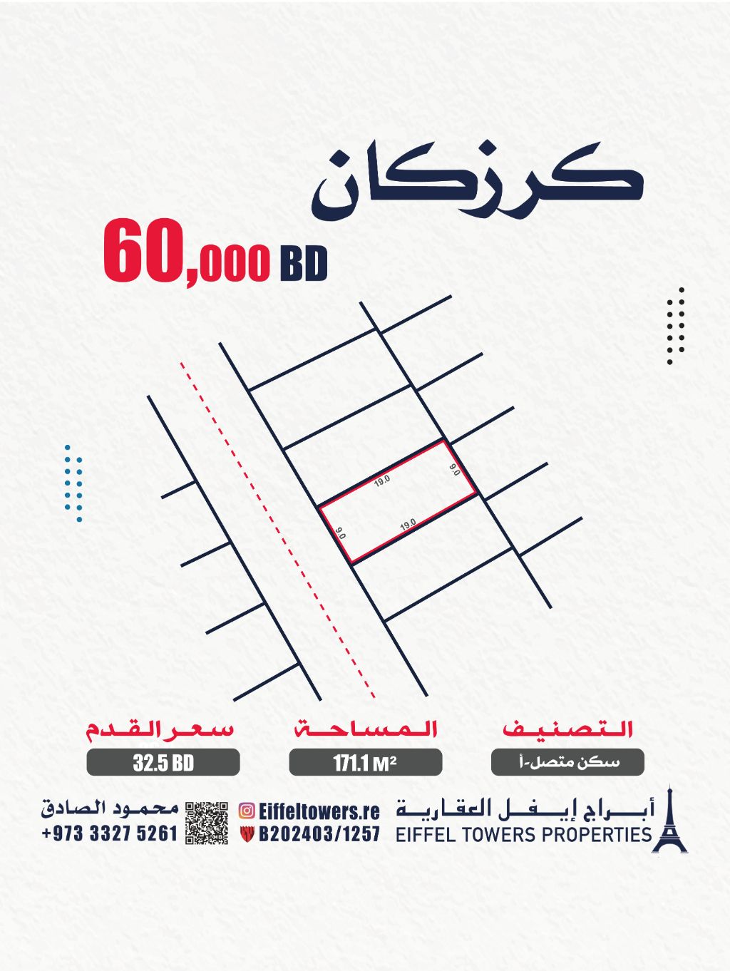 Eiffel Towers Real Estate Company offers for sale a land in Karzakhan with an area of 171.1 square meters, classified as residential connected (RHA), at a price of 32.5 BD per square foot and a total price of 60,000 BD. For contact, reach out to Mahmoud Al-Sadiq.