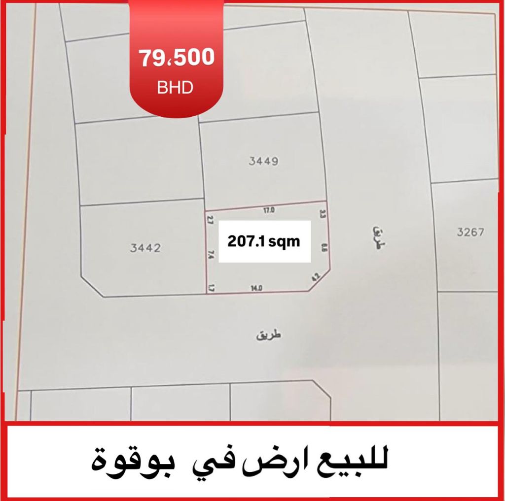 For sale A distinguished land in Bu Quwah (Saraya 2) corner plot on two streets, very strategic location. Area 207.1 SQM. Classification RHA. Price 79500 Bahraini dinars only. Price per square foot 35 dinars. For cash sale only. Location features Direct entrance and exit from the Highway