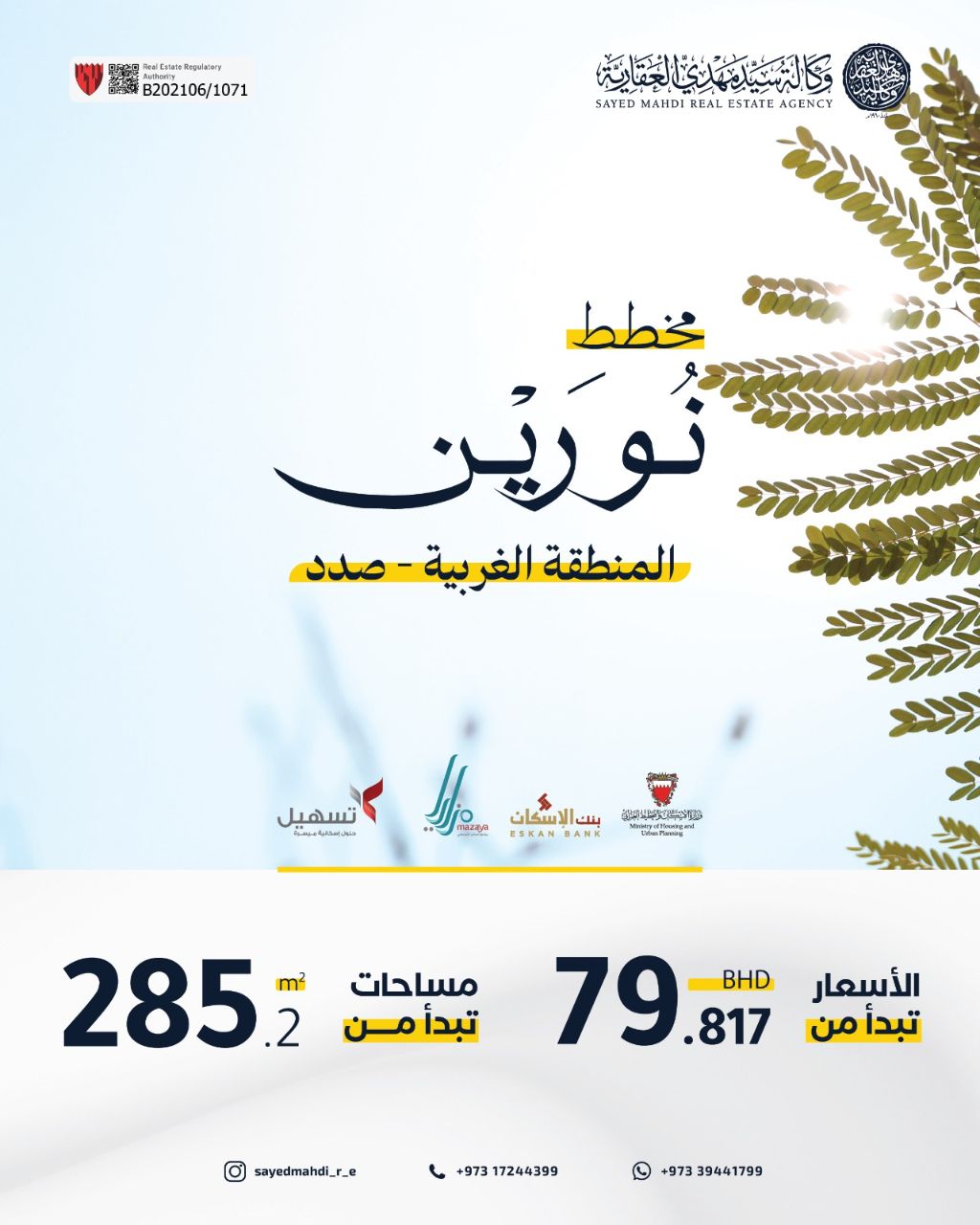 Noureen Residential Scheme, in accordance with the Ministry of Housing programs. Prices start from 79,817 Bahraini dinars for private residential plots. Area starts from 285.2 square meters. For more details, contact the certified real estate broker Mortada Al-Mutawa, representing Sayed Mahdi Real Estate Agency.