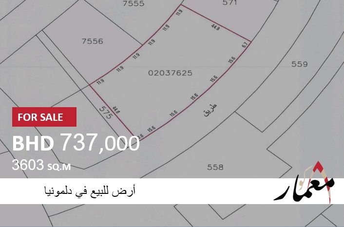 Land for sale in Delmonia, freehold ownership with an area of 3603 square meters. The requested price is 19 dinars per foot, and the total sale price is 737 thousand dinars, negotiable.