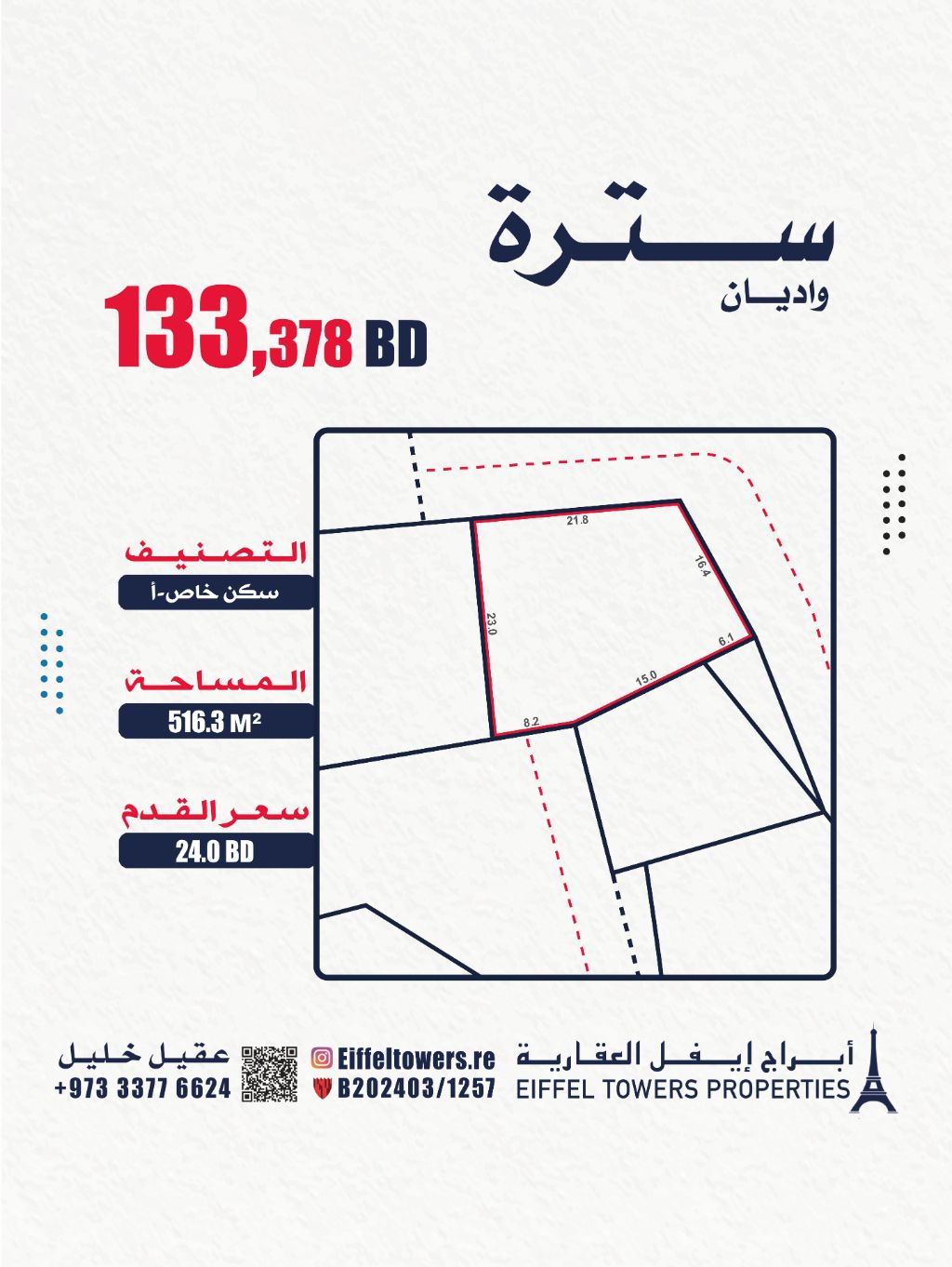 Eiffel Towers Real Estate Company offers for sale a land in Sitra, Wadiyan, with an area of 516.3 square meters. Classification: Private Residential (A RA). Price per square foot: 24 BD. Total price: 133,378 BD. For contact: Aqeel Khalil. Eiffel Towers Real Estate is an intermediary certified by the Real Estate Regulatory Authority, license number B202403/1257.
