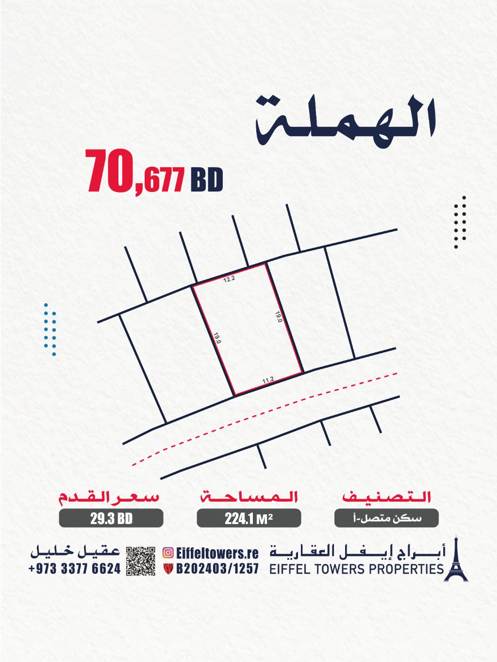 Eiffel Towers Real Estate Company offers for sale a land in Al Hamla with an area of 224.1 square meters. The classification is residential attached (ARHA). The price per square foot is 29.3 BD, and the total price is 70,677 BD. For contact, reach out to Aqeel Khalil at eiffeltowers.re. Eiffel Towers is an intermediary certified by the Real Estate Regulatory Authority with license number B202403/1257.