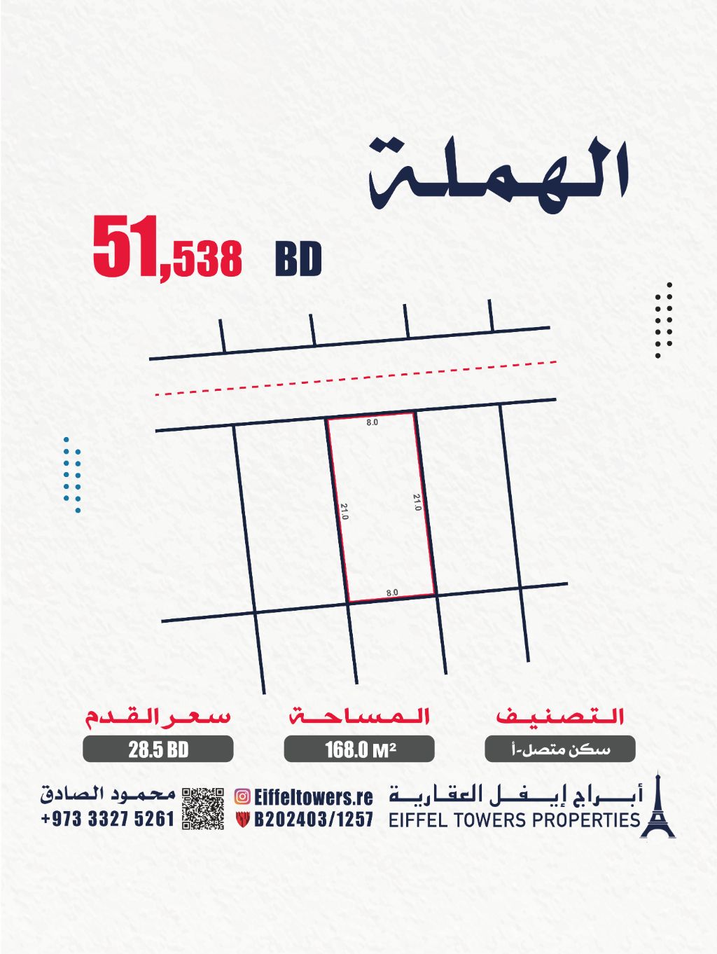 Eiffel Towers Real Estate Company offers for sale a land in Al Hamla with an area of 168 square meters, classified as residential attached (ARHA). The price per square foot is 28.5 BD, and the total price is 51,538 BD. For contact, reach out to Mahmoud Al-Sadiq via eiffeltowers.re. This is a broker certified by the Real Estate Regulatory Authority with license number B202403/1257.