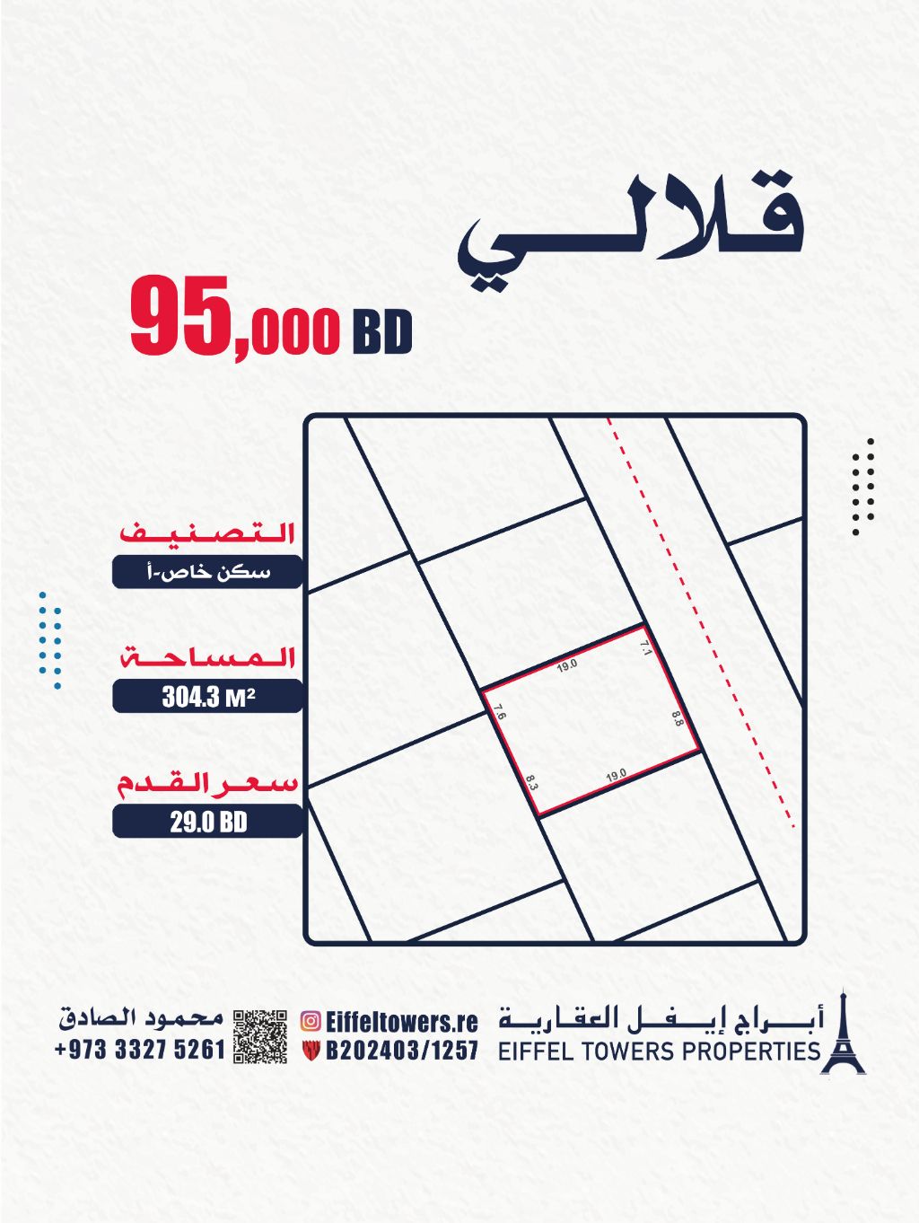 Eiffel Towers Real Estate Company offers for sale a land plot in Qalali with an area of 304.3 square meters. The classification is private residential (RA). The price per square foot is 29 Bahraini dinars, and the total price is 95,000 Bahraini dinars. For contact, call Mahmoud Al-Sadiq via eiffeltowers.re. The company is an intermediary licensed by the Real Estate Regulatory Authority with license number B202403/1257.